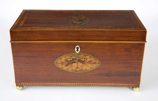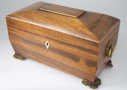 Large Regency Mahogany Tea Caddy, Floral Inlay on Lid, Olive Wood Leaf Paterae on Front