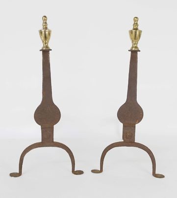 Pair of Antique Cast Iron Penny Foot Knife Blade Andirons with Brass Finial