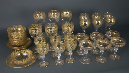Set of 36 Cut Crystal and Gilt Stemware, circa 1920