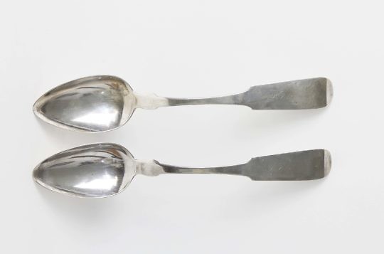 Pair of Nantucket “Easton and Sanford” (1830-1838) Coin Silver Tablespoons, Engraved “L. Folger”