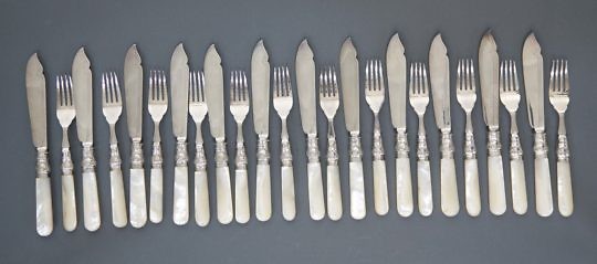 Set of 24 English Mother of Pearl and Silver Plate Fish Knives and Forks, circa 1890