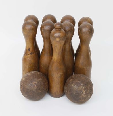 Antique Set of Carved Wood 9 Pins and Two Balls