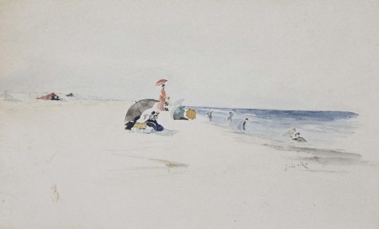 Rare Jane Brewster Reid Watercolor on Artist Board “Nantucket Jetties Beach Bathers”