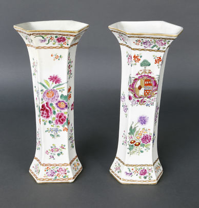 Pair of Chinese Export Armorial Coat of Arms and Floral Decorated Hexagonal Sampson Style Vases
