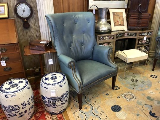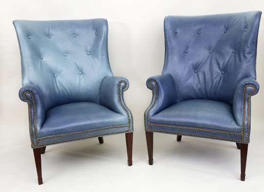 Pair of Hepplewhite Style Green-Teal Blue Leather Upholstered Barrel Back Wing Chairs