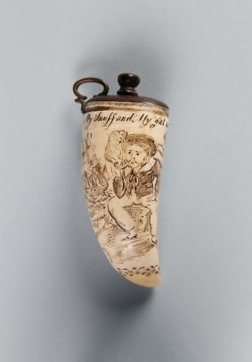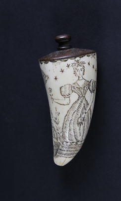 Scarce Carved Horn and Whale Ivory Scrimshaw Powder Flask, circa 1800