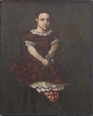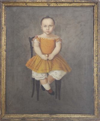 American School Oil on Canvas “Portrait of a Seated Child Holding an Apple”, mid 19th Century