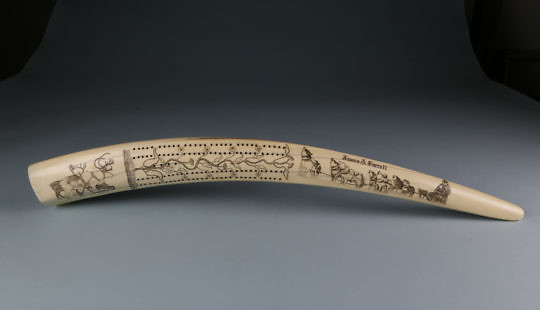 Fine Eskimo “James A. Farrell” Scrimshawed Walrus Ivory Tusk Cribbage Board, circa 1890-1900