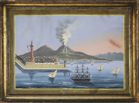 Pair of Italian Gouache “Bay of Naples and the Molo San Vincenzo Day and Night”, circa 1867