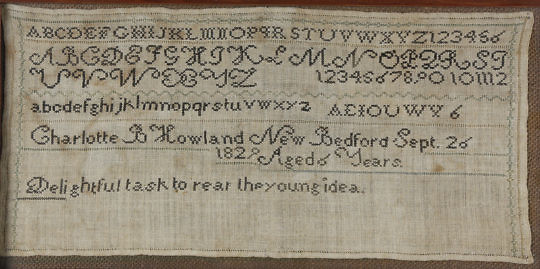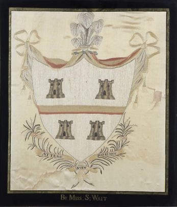 Miss S. Wait Silk Needlework “Attend with Patience” Coat-of-Arms, circa 1799