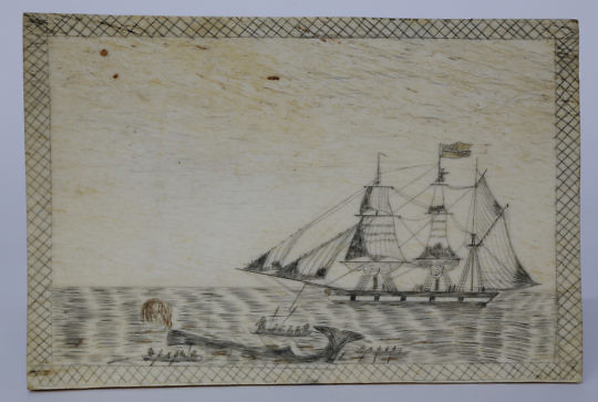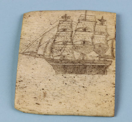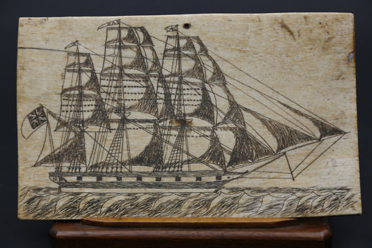Scrimshaw Panbone Plaque of a Three-Mast Whaling Bark, mid 19th Century