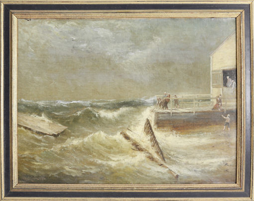 Charles Henry Gifford Oil on Canvas, “Saving the Pier in Stormy Seas”