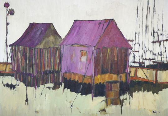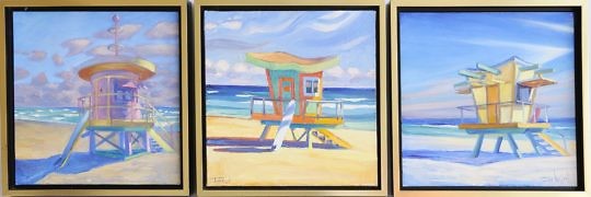 Three Illya Kagan Oils on Canvas “Triptych Lifeguard Station Huts”