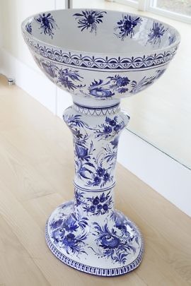 Italian Blue and White Baked Enamel Terra Cotta Sink on Pedestal Stand