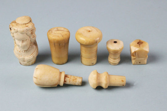Seven Carved and Turned Whale Ivory Walking Stick Tops and Knobs, circa 1840-1860