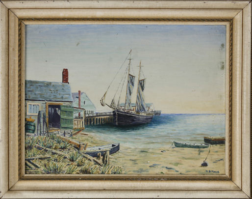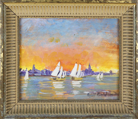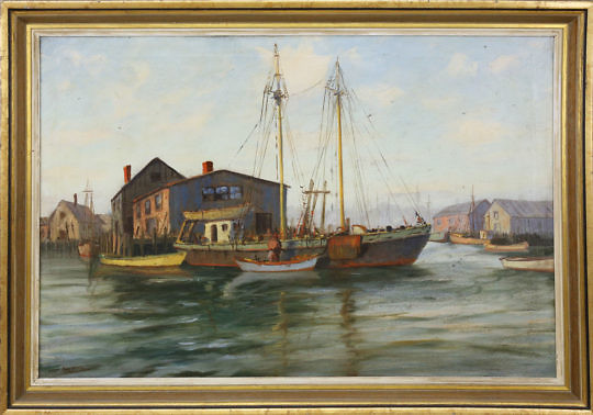 Vernon Broe Oil on Board, “Two Schooners Docked at Sunset”