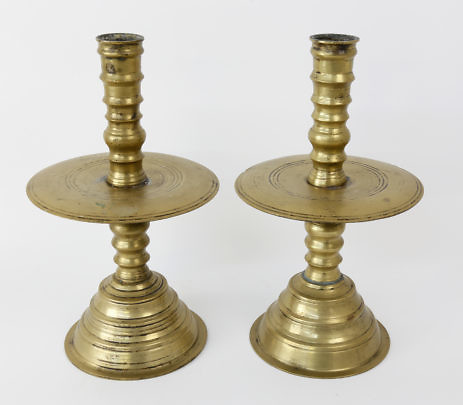 Pair of Dutch or English Brass Trumpet Base Bobeche Candlesticks, 17th Century