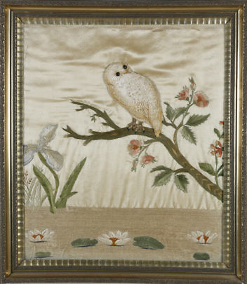 Trapunto Silk Embroidery of a Snowy Owl on Flowering Tree Branch