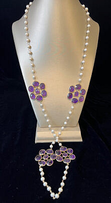 5.5mm White Fresh Water Pearl and Faceted Amethyst Cluster Sterling Silver Vermeil Necklace