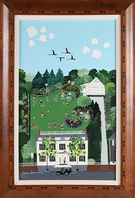 Elizabeth Mumford Folk Art Oil on Board “View of Lower Main Street”