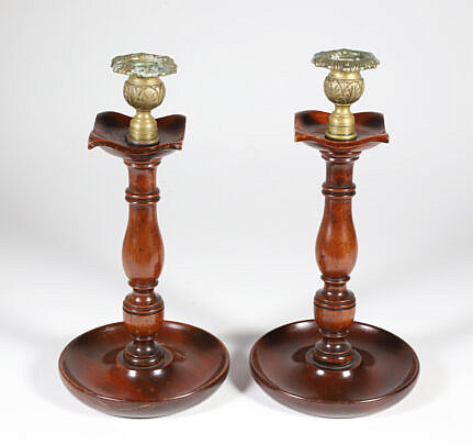 Pair of Turned Mahogany and Repousse Brass Candlesticks, 19th Century