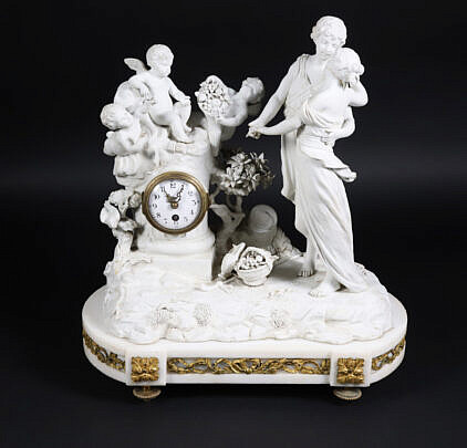 French Bisque and Marble Figural Mantel Clock, circa 1820-40