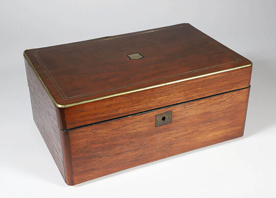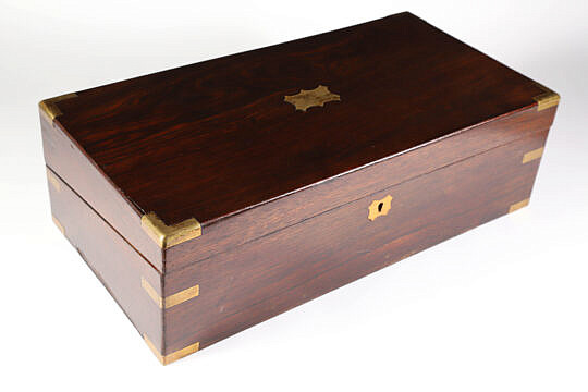 Brass Bound Dovetailed Mahogany Traveling Desk Box with Three Hidden Drawers, 19th Century