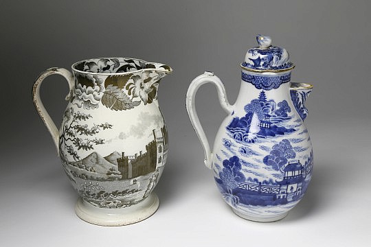 Staffordshire Sepia Transfer Decorated Earthenware Jug & Chinese Export Porcelain Chocolate Pot