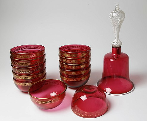 Set of Twelve Gilt-Decorated Cranberry Glass Finger Bowls & Large Cranberry Glass Wedding Bell