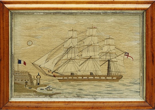 British Sailor’s Woolwork of an Unidentified Warship Approaching a French Fort, Circa 1850