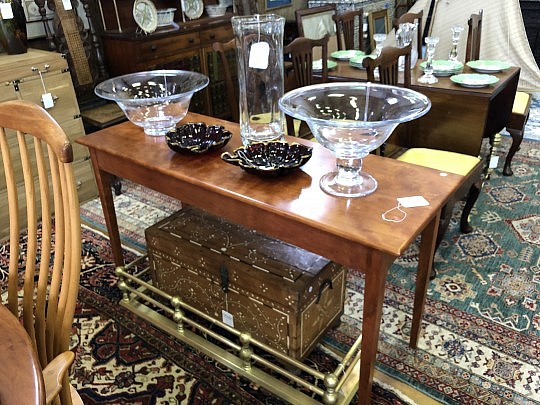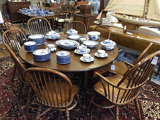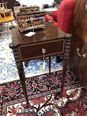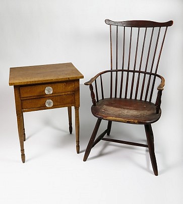 American Sheraton Tiger Maple Two Drawer Work Stand, New England Red Stained 9 Spindle Fan-back Windsor Armchair