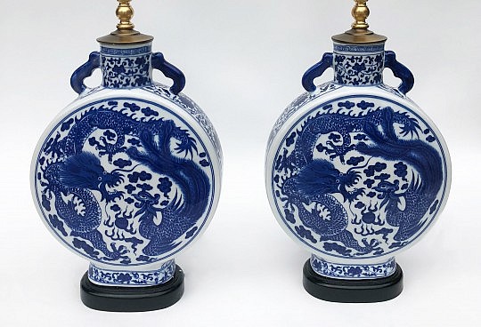 Pair of Chinese Blue and White Porcelain Flask Lamps