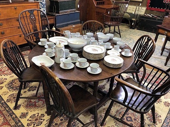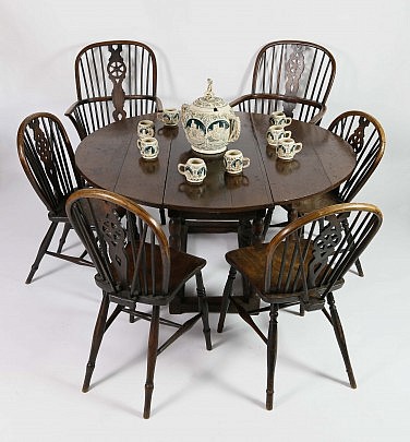 6 English Windsor Elmwood Dining Chairs and 18th Century English Oak Dining Table