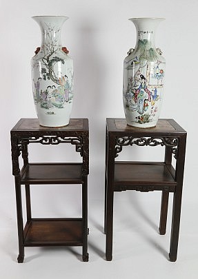 Two Famille Rose Chinese Porcelain Vases and Two Chinese Pedestal Tables