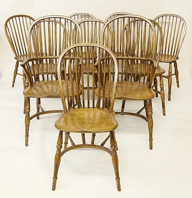 Set of Ten English Elm Wood Windsor Style Bow Back Dining Charis