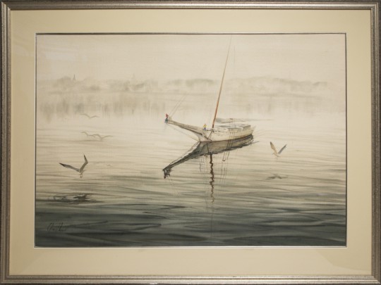 C. Robert Perrin Watercolor on Paper “View of the Sailboat Brumble in Nantucket Harbor”