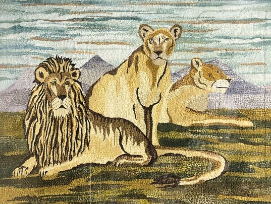 Mellie Cooper Hand Crafted Trompe l’Oeil Paper Sculpture of a Hooked Rug Depicting a Family of Lions