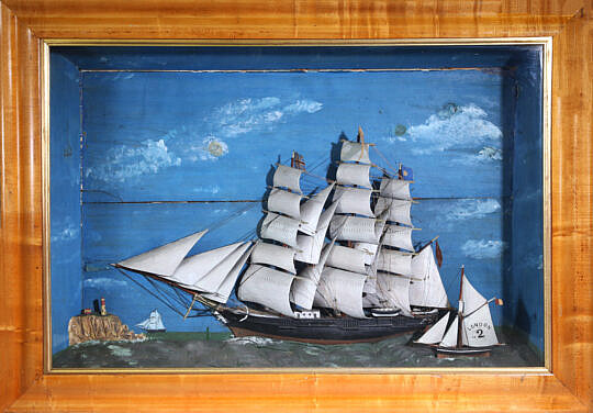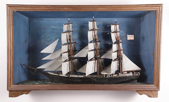 Antique Folk Art Miniature Naval Ship Bow Front Shadowbox, 19th century