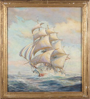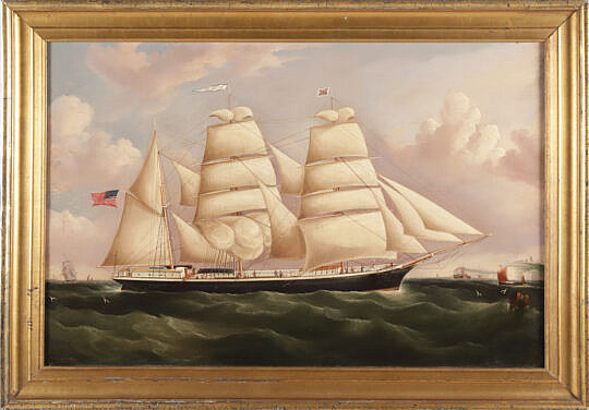 Antonio Jacobsen Oil on Panel “Three-Masted Clipper Ship Annie H. Smith”, circa 1917