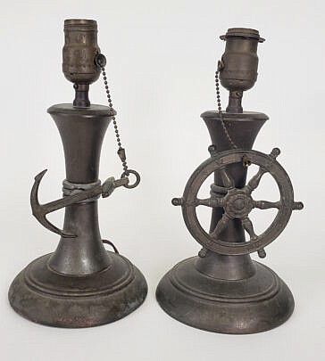 Pair of Antique Anchor and Ships Wheel Nautical Lamps