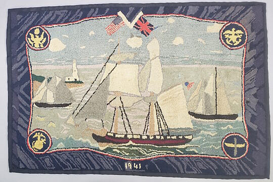 Extraordinary Vintage WW2 Pictorial Nautical Hooked Rug, circa 1941