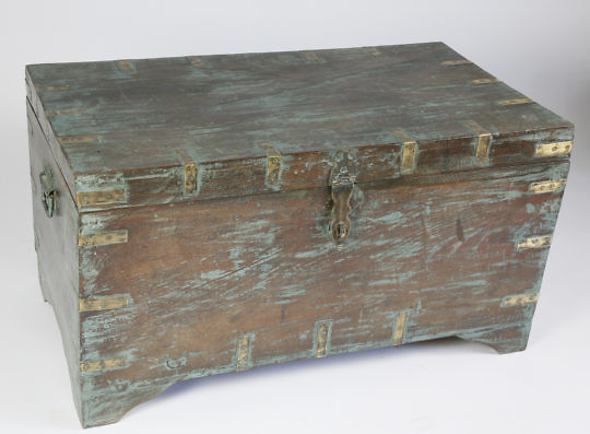 Contemporary Teak Brass Bound Trunk with Blue Washed Paint
