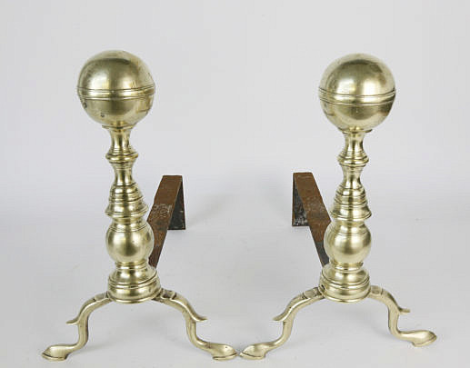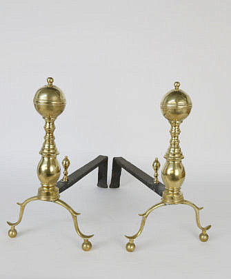 Pair of Brass Boston Ball Top Andirons, early 19th Century