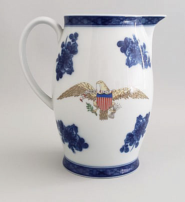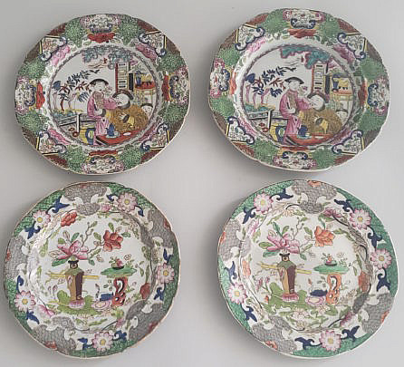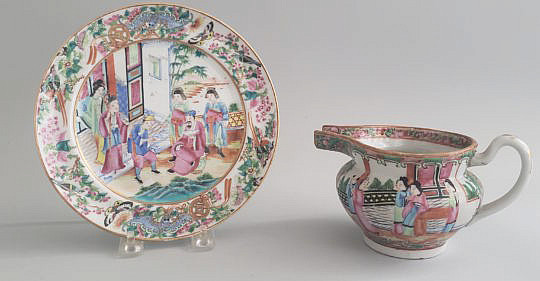 19th Century Chinese Rose Mandarin Plate and Medallion Hog Nose Creme Pitcher