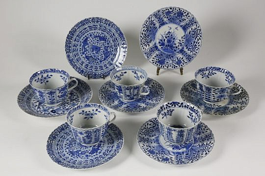 Six Assembled Canton Blue and White Cups and Saucers, mid 19th century