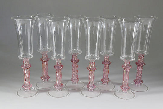 Eight Venetian Hand Blown Glass Champagne Flutes, 20th Century
