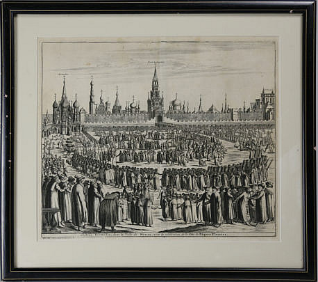 Engraving: “Château Kremelin, dans la ville de Moscou, avec la celebration de la Fete de Pâques Fleuries”