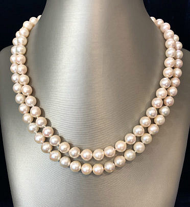 White Fresh Water Pearl Double Strand Necklace, 14k Yellow Gold Clasp