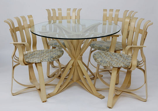 Frank Gehry for Knoll Vintage “Face Off” Glass Top Table and 4 “Hat Trick” Bentwood Armchairs