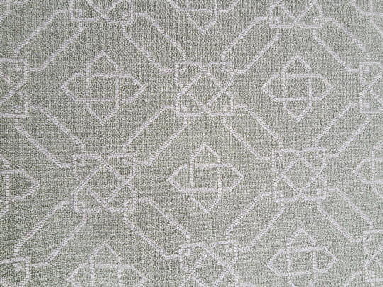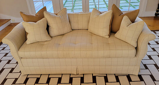 Custom Houndstooth Home Creme Upholstered Sofa and Six Pillows